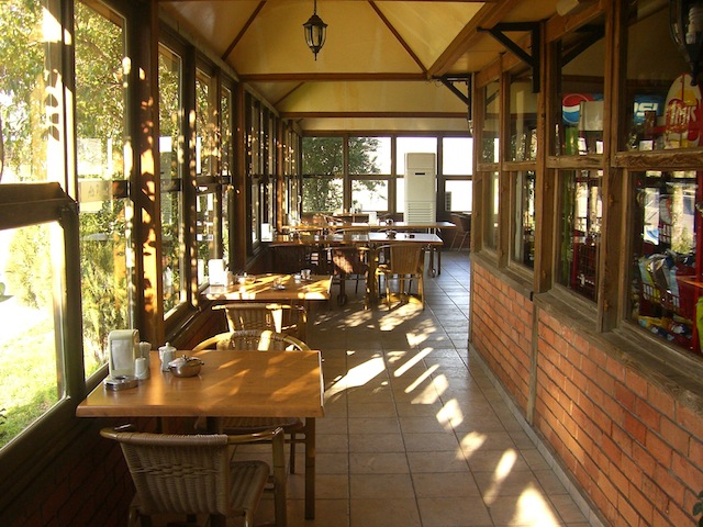 ドライブインと言う言葉が懐かしい印象をあたえます。私個人がイメージするドラブインは田舎の道路に塗装がはげた“ドライブイン”と言うカタカナ文字の大きな看板があり、店舗の入り口に廃業の看板がさしてあるイメージです。ドライブインと言う看板を見るたびに、いつも思う事は、ドライブインの看板がドライブインのイメージを悪くしている様に感じています。何か別の表現方法にした方が、品があるでしょう。そのイメージは決して、素敵と言うイメージはありませんでした。トルコバス旅行の時にトイレ休憩で訪れたドライブインがとても素敵で、思わず写真を撮影してしまいました。看板の主張もありません。プランとしては、シンプルで中央部分に店舗がありそれを囲む(回廊)様にカフェテーブルが配置されていました。木造で暖かみがある建築ですが、素材もレンガや天井もただ平では無く、三角錐を組み合わせした幾何学的なデザインも印象的なカフェでした。構造的な観点からいくと、360°窓ですので、耐力壁は何処にあるの?と言う建築でしたが、とても美しい建築でした。