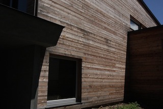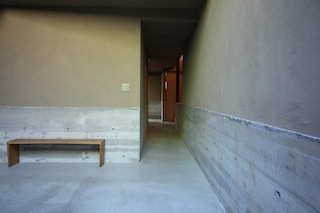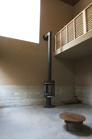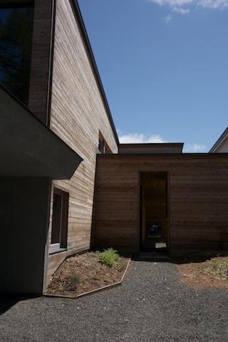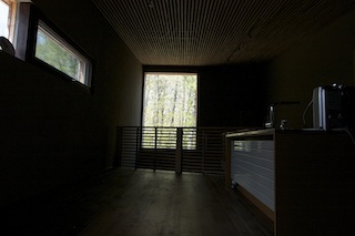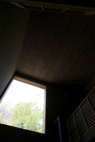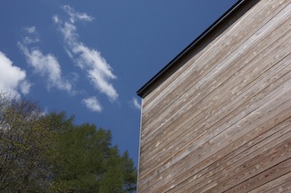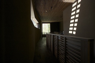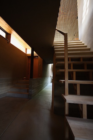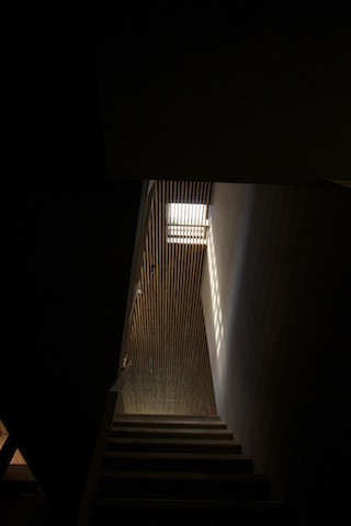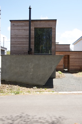 敷地は札幌市近郊の緑豊かな住宅街に位置します。道路を隔て向かいの敷地は樹木が連続する敷地が存在します。そこには自然以外の存在がありません。夏は植物の緑でいっぱいになり冬は植物が落葉し遠くの樹木と手前の樹木の動きの違いを楽しむ事ができます。その樹木の中で一際目を引く樹木が1本あります。唐松です。直径300mm高さ20m程ある大木は、唐松独特の樹皮が樹齢を重ね一つ一つの樹皮が大きく生々しい力を秘めています。この樹皮が力を放つ瞬間は、雨の時です。雨を葉に受け葉・・枝・・幹と徐々に幹に雨が伝わります。雨が降り始めてから1時間程経つと、乾燥した幹の樹皮が徐々に雨で赤黒く湿って行きます。幹の樹皮が乾燥から湿潤へ表情を変える瞬間が最も美しい瞬間です。樹皮の変化を最も肌で感じる事が出来る位置に2階床レベルを配置し、その場所に家族の活動拠点を配置しました。建築はピクチャーウィンドウ「唐松」を中心に空間構成を構築しました。敷地は前面道路より600mm程高く道路からのアプローチは緩やかにスロープで高低差を無意識に上ります。エントランスに入ります。エントランスの光は最小限に押えられ洞窟にいる様な感覚を与え、階段を600mm降ります。暗いエントランスから長い廊下先のラウンジを眺めると、光の溜まりがあり、その原因が何かは直接伺う事が出来ません。そして、エントランスホールにある階段から2階へ移動します。階段からラウンジ方向と2階方向を眺めると、階段手摺の線、2階天井に設けられた線を感じながら階段を登るとその先には美しい「唐松」が存在します。