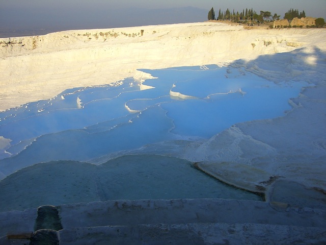 大地の白色と温泉水の水の色が混ざって、青白くなっているのがとても美しいです。この石灰棚は200m程続き更に石灰棚からこぼれた温泉水の影響で、その付近全体が白色になっています。早朝観光に行ったので、ヒンヤリした空気と透明感のある空気がとても気持ち良かったです。