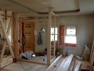玄関クローク壁の下地組立作業が行われています。